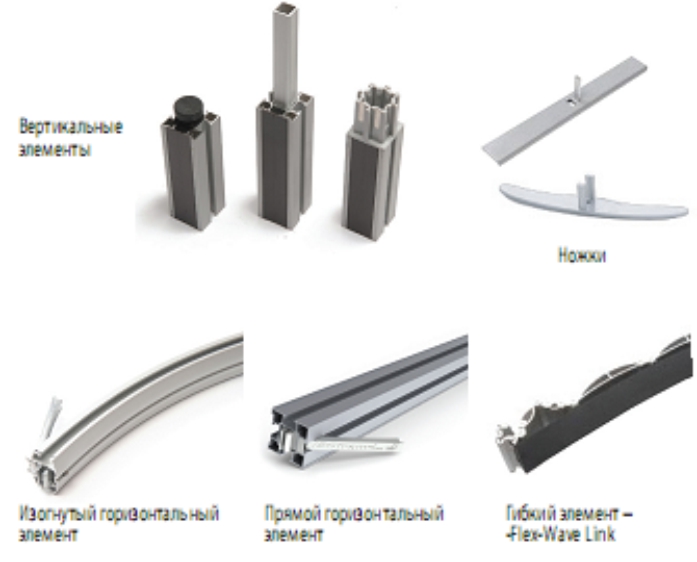 Горизонтальные элементы стандартны по длине, как в ISOframe Wave и ISOframe Compact - для полотна шириной 800 мм: прямой, изогнутые (нескольких радиусов кривизны), и гибкий (с переменным радиусом