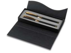Набор: Перьевая ручка, шариковая ручка с поворотным механизмом и кожаный футляр в чёрной картонной коробочке.
